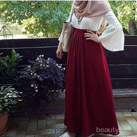 Rok dengan model span warna polos ini masih sangat diandalkan oleh para hijabers untuk tampilan hijab casual feminine-nya. Padu padannya dengan sneakers dan kemeja bermotif juga bisa mengimbangi style agar lebih berwarna dan santai. Padu padan ini cocok banget untuk kamu gunakan saat hangout atau bersilaturahim bersama keluarga besar di akhir pekan.