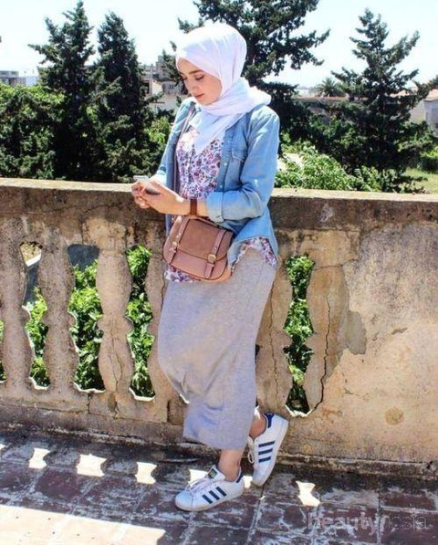 Siapa bilang sneakers cuma cocok untuk dipadukan dengan rok dan atasan yang boyish? Tampilan padu padan hijab dengan rok dan blouse ini memang terlihat sangat rapi dan formal, tetapi padu padannya dengan sneakers akan memberikan kesan unik dan fashionable tersendiri. Kamu bisa menggunakan sneakers dengan warna putih untuk menambah kesan elegan dan rapi.