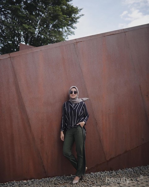 Padu padan style hijab casual ala Mega Iskanti memang tidak ada habisnya. Lihat saja gayanya dengan memadukan kemeja berdetail kerut motif stripes dengan basic pants. Warna basic natural seperti abu-abu, hitam, dan hijau lumut membuat tampilan Mega semakin terlihat simpel. Cocok banget untuk dipakai saat ke kampus atau hangout dengan teman-teman.