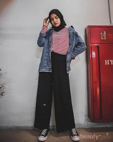 Item celana kulot memang banyak digemari oleh para hijabers. Hal ini dikarenakan celana kulot memiliki potongan yang loose sehingga memberikan kesan yang santun saat digunakan. Untuk tampilan yang casual kamu bisa memadukannya dengan long stripe blouse dan jaket jeans yang menghasilkan tampilan yang simple namun terlihat stylish.