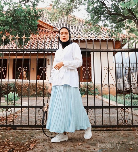 Rok plisket merupakan fashion item yang sedang hits di kalangan para hijabers. Kamu juga bisa tampil casual dengan rok plisket sehingga memberikan kesan yang lebih girly. Biar gak ribet saat memakai rok plisket padukan dengan atasan kemeja putih polos dan sneaker berwarna putih. Simple but chic!