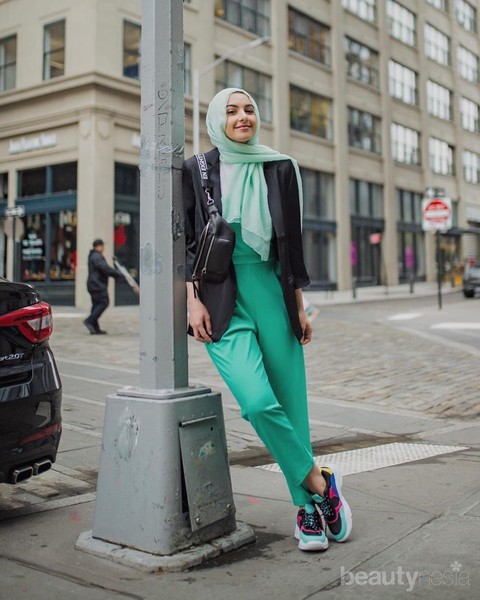 Blazer yang biasanya dikenakan untuk acara-acara formal bisa juga lho dikenakan untuk gaya hijab casual yang lebih santai dan modis. Padukan blazer berwarna hitam dengan setelan atasan dan bawahan berwarna hijau. Jangan lupa kenakan sneakers berwarna-warni untuk gaya yang lebih stylish.