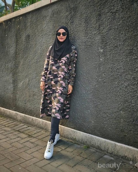 Salah satu style hijab yang sedang tren saat ini ialah perpaduan antara tunik dengan legging. Karena tunik memiliki ukuran yang lebih panjang dari blouse biasa pada umumnya, maka ketika dipadukan dengan legging masih terlihat santun. Seperti style berikut mengenakan atasan tunik dengan motif army dan legging berwarna hitam juga sneakers putih.