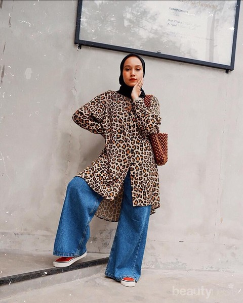 Tunik memang menjadi fashion item andalan para hijabers, karena tunik memiliki model yang panjang dan longgar sehingga tidak membentuk tubuh. Tunik dengan model kemeja ini juga menjadi pilihan yang tepat untuk kamu yang ingin tampil dengan modis. Seperti style casual yang satu ini: memadukan tunik kemeja dengan motif animal print dan jeans akan menghasilkan style yang keren. Dan tentunya nyaman dikenakan saat hangout