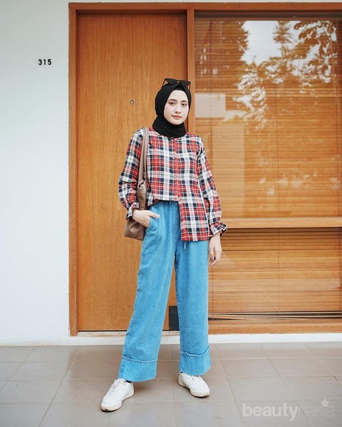 Celana jeans juga menjadi item yang sering dikenakan untuk menciptakan tampilan hijab yang lebih kasual dan kekinian. Padukan light blue jeans berpotongan lurus dengan atasan kemeja motif plaid. Agar tampilan terlihat lebih stylish salah satu sisi kemeja dimasukan ke dalam celana dan yang lainnya dibiarkan keluar. Kenakan sneakers untuk menyempurnakan tampilan casual kamu.