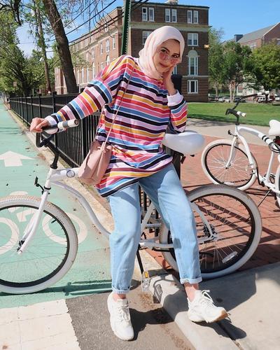 Tanpa banyak aksesoris, ia sudah kelihatan bersinar dengan kaus oversize berpola stripe warna-warni. Kamu pasti mau juga pakai kaus kece ini untuk tema spring atau summer kan, Ladies?Menariknya agi, Albarcha bisa terlihat chic tanpa banyak effort, tidak perlu pasang belt di pinggang, kausnya juga dibiarkan begitu saja tanpa dibuat masuk ke celana atau yang lainnya. Cukup dipadukan dengan jeans kesayangan, kerudung senada, dan bucket bag yang simpel. Cantik, ya?