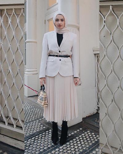 Masih dengan blazer, kali ini Albarcha memakai ankle boots hitam. Penampilannya terkesan bold dengan sisi feminin yang tetap ditegaskan pada pemakaian pleated skirt. Dengan nuansa pastel, hitam-putih, dan tambahan belt yang stylish, gaya Albarcha ini bisa kamu coba untuk dapatkan semi-formal look yang profesional!