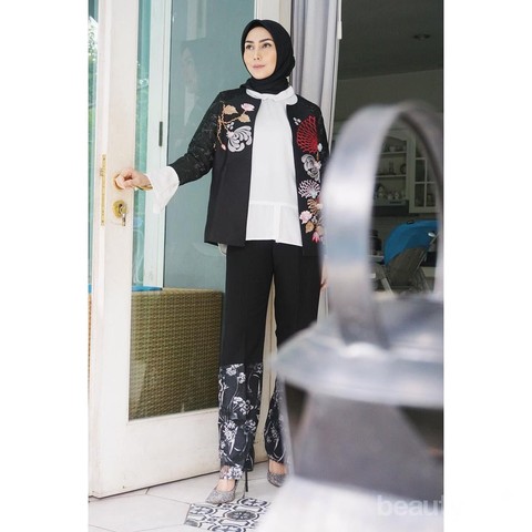 2. Gaya black and white mengenakan blazer dengan detail embroidery dan celana dengan kombinasi motif floral dibagian bawah.