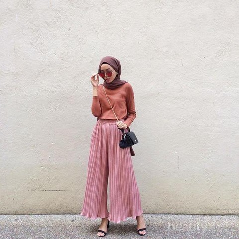 Ini memang saran yang cocok untuk para hijabers, yaitu gunakan kulot yang benar-benar menyerupai rok. Tujuannya agar bawahan kulot tidak membentuk tubuh kalian secara terlalu jelas. Selain itu, memang rok adalah bawahan yang disarankan untuk para wanita muslimah.