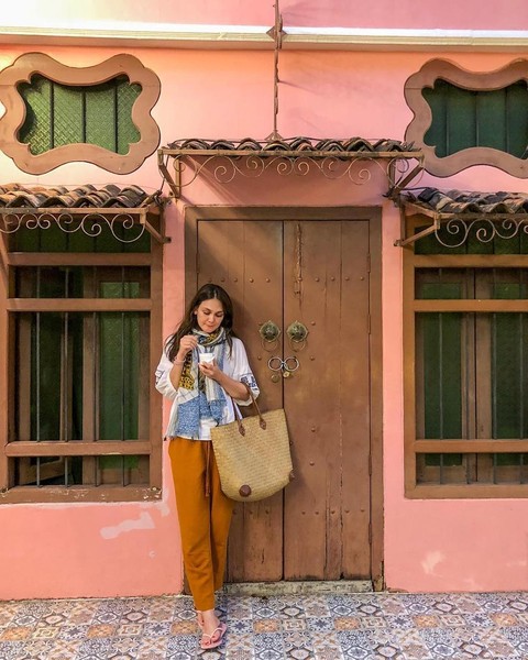 Foto: https://www.pinterest.com/Pada foto ini, Luna menggunakan white embroidery blouse dengan shawl dan brown trousers juga straw bag. Style ini memang simple dan cocok banget untuk kalian gunakan ketika berlibur. Dengan background yang unik dan style pakaian simple ethnic ini, Luna terlihat begitu manis dan terlihat sangat menikmati hari liburannya.
