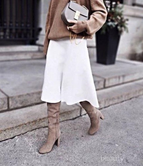 Nah, ini hal yang paling basic yang dapat kamu lakukan. Kamu tentu memiliki kaos kaki dengan panjang selutut dengan warna netral. Kalaupun tidak, kamu dapat dengan mudah menemukannya dan membelinya. Seperti halnya legging, kamu hanya perlu memadankannya dengan warna midi skirt yang kamu kenakan. Styling seperti ini membuat kamu lebih simple, dan fleksibel untu dipakai kemanapun. Kamu dapat menggunakan flat shoes, boots, dan sandal.
