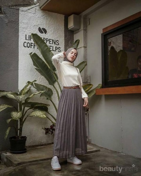 Mau tetap tampil casual saat hangout bareng teman? Yuk, coba inspirasi hijab style dengan perpaduan blouse putih dengan rok plisket satu ini. Ladies, untuk kamu yang ingin tetap tampil casual, cobalah untuk mengkombinasikan warna-warna nude dalam pakaianmu. Seperti blouse berwarna putih yang cocok untuk dipadukan dengan warna apapun. Kemudian kamu juga bisa memilih rok plisket dan hijab dengan warna senada agar tampilan tidak terlalu mencolok, sehingga kamu tetap memberikan kesan lembut.