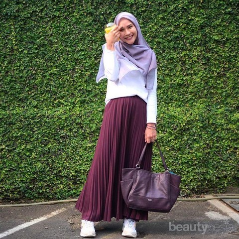 Ladies, ingin tampil cantik tapi males ribet? Yuk, coba inspirasi perpaduan style hijab dengan t-shirt dan rok plisket ala Zaskia ini. Hangout bareng teman kadang bikin kita bingung memilih pakaian apa yang cocok untuk dikenakan, untuk kamu yang males ribet cobalah untuk mengaplikasikan t-shirt polos dengan rok plisket seperti Zaskia ini. Tanpa meninggalkan kesan casual, perpaduan ini juga membuat kamu tampak lebih energik lho. Kamu bisa mencoba rok plisket dan hijab dengan warna senada, cobalah untuk memilih hijab yang sedikit bermotif agar tampilan kamu lebih hidup. Kemudian, pilihlah t-shirt polos dengan warna cerah seperti putih untuk membuat tampilan lebih fresh.