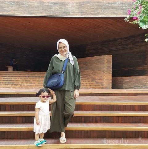 Ria Miranda membuktikan kalau kamu yang berhijab juga tetap bisa tampil kece ke pantai tanpa takut kelihatan salah kostum. Hijab style Ria saat liburan ke Bali bersama keluarganya ini ini terlihat casual, nyaman dan “enggak gerah. Designer modest fashion ini memadukan palazzo pants hijau army dengan tunik berwarna senada. Outfit serba longgar memang paling nyaman dikenakan saat traveling apalagi di tempat yang panas seperti di pantai. Untuk alas kaki, Ria memilih sandal slip on yang nyaman.