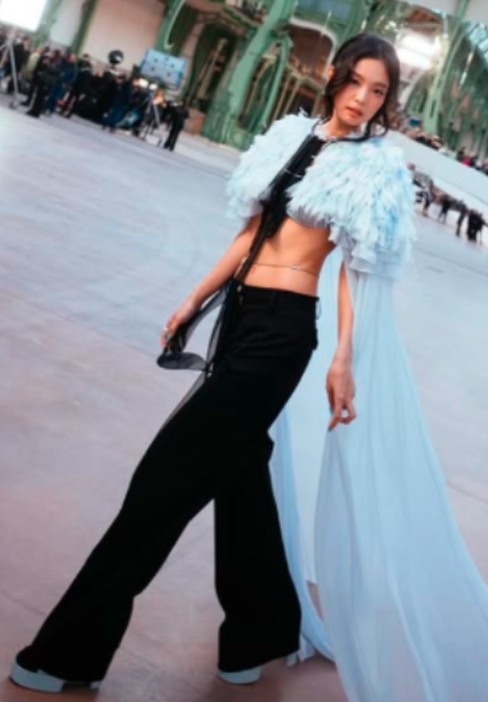 Jennie Kim memang selalu tahu cara buat kepala menoleh! Ia tampil effortlessly chic dalam setelan Chanel yang sukses mencuri perhatian. Celana hitam lebar dipadukan dengan cape berbulu warna baby blue yang super glam, terkait material sheer menjuntai dalam warna senada yang membuatnya terlihat ethereal.