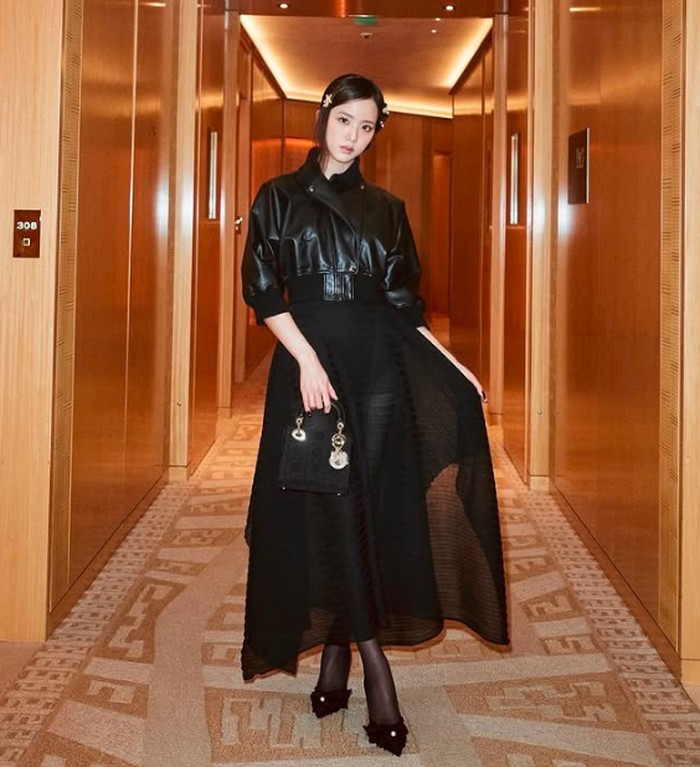 Jisoo tampil dalam balutan busana serba hitam dari Dior yang memancarkan aura klasik nan elegan. Jaket kulit cropped yang dipadukan dengan rok sheer bertekstur menciptakan siluet yang kuat namun tetap feminin.