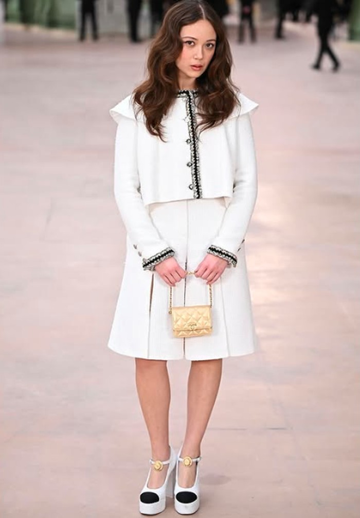 Kylie Jenner tampil dengan aura Parisian chic mengenakan setelan Chanel serba putih yang menggabungkan klasik dan sensasi modern. Crop jacket dengan detail tweed khas Chanel dipadukan dengan mini skirt dan aksesori rantai yang menjuntai, menciptakan tampilan yang effortlessly glam.