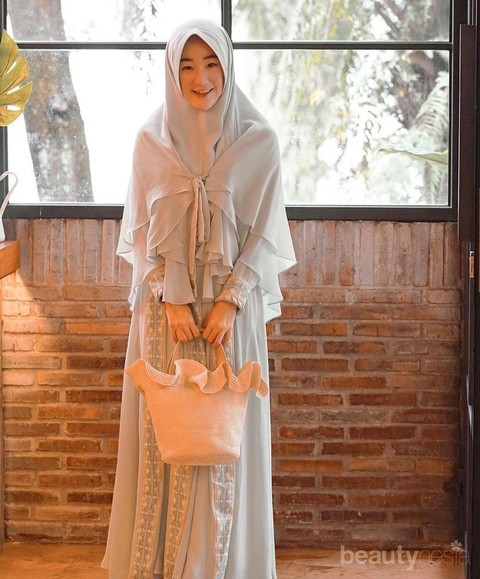 Jika bosan memakai jilbab syar’i biasa, kamu bisa mencari jilbab syar i terbaru yang memiliki aksen tambahan. Seperti hijab instan yang dipakai Larissa Chou ini. jilbab syari’i instan warna abu-abu itu nampak mewah dan elegan dengan potongan berlapis ditambah aksen tali di bagian depan. Hijab jenis ini cocok untuk menghadiri pesta.