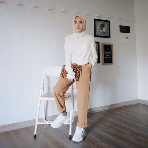 Dengan kaos turtle neck putih, pants coklat, dan sepatu sport membuat Nisa Cookie terlihat sangat kasual. Hijab style ini tidak sulit untuk kamu tiru lho, Beautynesian. Selain itu gaya ini juga nyaman dan memudahkan untuk ibu ibu muda pergi bersama anak. Sepatu putih akan membuat kamu kekinian banget, kamu tentu akan tetap terlihat modis dan lebih muda dengan hijab style kekinian ini.
