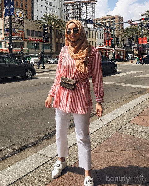 vertical stripe and mix it with white jeans either waist bag plus sneakers. Jadi deh, style hijab yang pas banget untuk kamu pakai