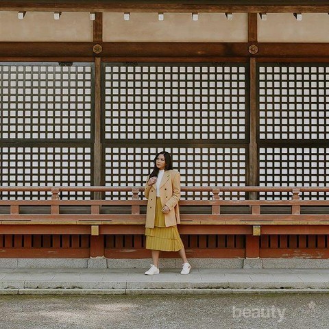 Dengan rok sebetis yang cukup simple hanya ada beberapa layer dan modelnya rempel ini terlihat elegan, dengan mix baju turtle neck berwarna putih ini yang selaras dengan sepatunya, kemudian ada blazer berwarna soft yang cocok dengan warna roknya yang agak coklat match yang tidak membosankan dan bisa kalian gunakan saat pergi keluar negeri, atau musim dingin ya.