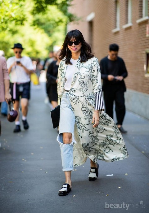 Memadukan celan jeans sobek dengan atasan kaus polos dan outer bermotif unik bisa banget jadi inspirasi kamu yang mau tampil kece badai. Jangan lupa juga untuk menambahkan aksesoris kacamata biar penampilan kece kamu lebih maksimal.