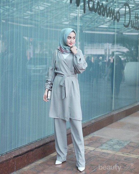 Lengkapi penampilan kamu dengan hijab atau pashima dengan warna yang lebih lembut agar sediki contrast sebagai pelengkap setelan berwarna gelap.