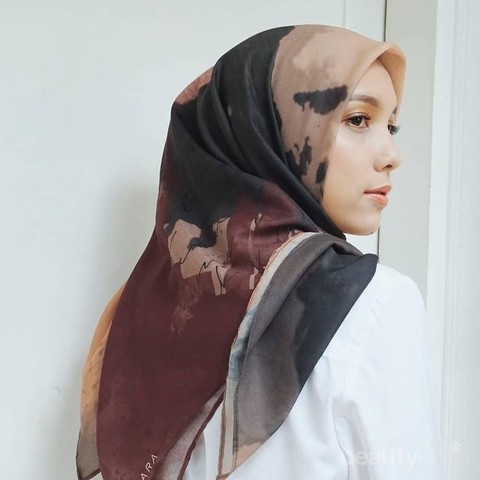 Selanjutnya, Jenahara tampil elegan dalam balutan hijab bermotif abstrak. Bentuknya yang menyerupai gumpalan awan, ditambah lagi dengan garis-garis hitam seperti tulisan membuat kesannya sangat eksklusif. Meskipun Jenahara menyisipkan warna hitam di dalam hijabnya ini, perpaduan warnanya tetap klop dengan maroon, grey dan coklat susu.