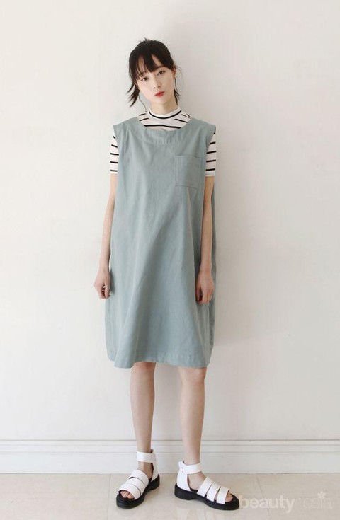 Satu lagi gaya lucu ala wanita Korea, yaitu oversize overall dress atau luaran yang “gombrong”. Gaya ini bisa kamu kenakan bersama dengan kaos yang lebih pas di tubuh ya. Selain overall dress, overall model celana yang oversize juga bisa kok variasikan untuk jalan-jalan.
