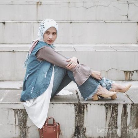 Dwi Handa memilih untuk memadu padankan fringe jeans dengan flare blouse dan vest denim yang membuat penampilannya sangat menarik. Gaya tumpuk ini cocok banget untuk kamu yang bertubuh kurus karena dapat membuat kamu terlihat lebih berisi.