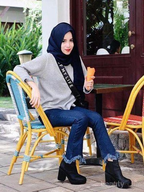 Selebgram cantik satu ini memadu padankan fringe jeans dengan sweater abu-abu yang cocok banget kamu gunakan untuk gaya sehari-hari. Untuk membuat penampilannya semakin fashionable, Aghnia menggunakan angkle boots dan gaya hijab yang sederhana.
