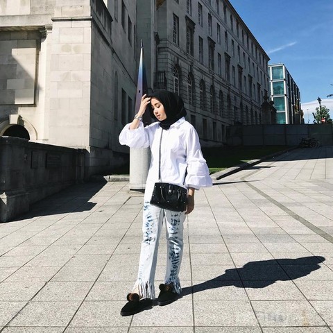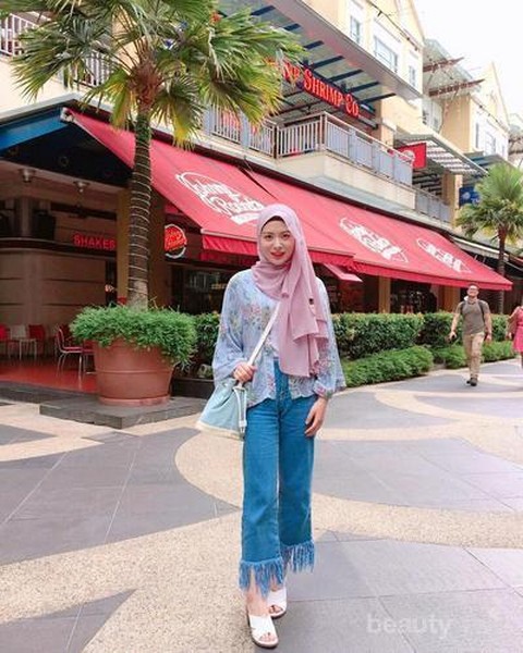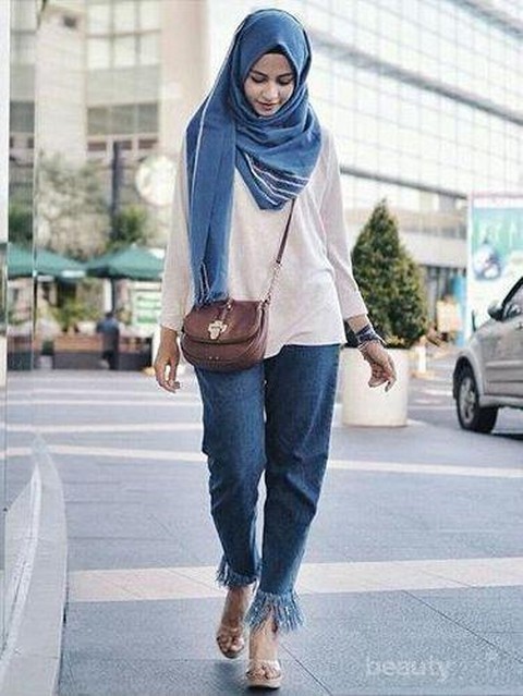 Buat kamu yang ingin tampil beda menggunakan fringe jeans, kamu bisa mencotek gaya selebgram Thatal Jundiah ya ladies. Ia memilih menggunakan fringe jeans bemotif yang dipadukan dengan kemeja putih. Agar tidak terlihat “penuh”, ia menggunakan hijab hitam yang simpel.