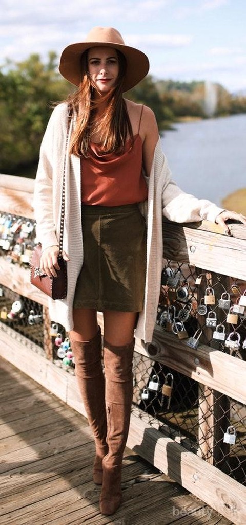 Penggemar Asian fashion wajib banget coba inspirasi outfit berikut ini. Sebuah loose sweater warna cokelat susu akan terlihat bagus banget dipadukan dengan mini skirt warna cokelat tua. Perpaduan warna ini menonjolkan warna kulit dan rambut kamu. High knee boots juga pas banget untuk mengisi bagian betis yang kosong, lho! Kamu bisa menggantinya dengan kaus kaki panjang dan sneakers atau flat shoes