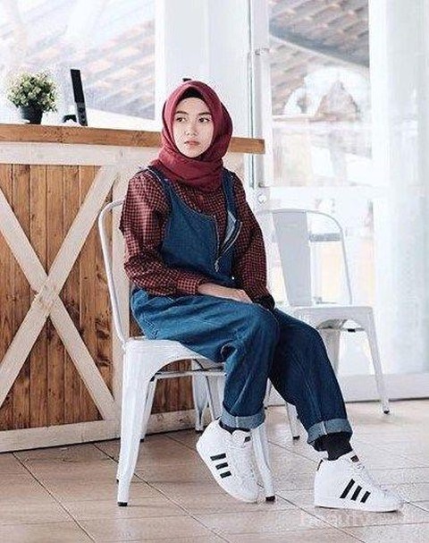 Ciptakan tampilan yang tidak biasa dengan memadukan overall jeans kesayangan kamu dengan kemeja kotak-kotak lama milikmu. Gunakan tone warna gelap seperti memadukan overall jeans warna navy dengan kemerja kotak-kotak warna maroon dan tambahkan hijab dengan warna yang senada dengan overall jeans atau kemeja kamu agar tampilan kamu semakin keren dan gorgeous.