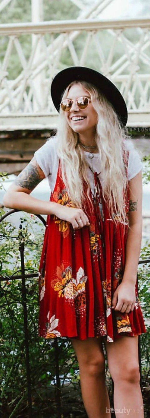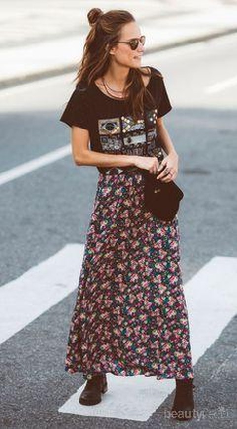 Jika kamu ingin mendapatkan penampilan boho style yang lebih kasual, kamu bisa memilih untuk menggunakan rok dengan motif floral. Bisa maxi dress maupun rok pendek yang kemudian kamu padukan dengan kaos yang dimasukan. Untuk sepatu, tentu saja boho style akan terlihat semakin menarik dengan menggunakan ankle boots. Pilihlah kaos yang motifnya tidak terlalu ramai untuk dipadukan dengan rok floral yang kamu gunakan. Memilih untuk menggunakan kaos polos juga akan terlihat menarik.