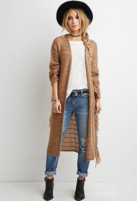 Berbeda ketika kamu ingin menghadiri festival musik, boho style untuk sehari-hari tentunya akan lebih simpel. Salah satu yang bisa menjadi inspirasi paling mudah adalah dengan menggunakan cardigan panjang yang kemudian kamu padukan dengan celana jeans. Agar penampilan kamu semakin oke, kamu bisa menggunakan ankle boots. Permainan warna bisa menjadi kunci yang membuat penampilan kamu boho banget. Untuk memadukan cardigan dengan celana jeans, kamu bisa memilih cardigan berwarna coklat dan dalaman berwarna putih. Tambahkan juga kalung sebagai aksesoris pemanis.