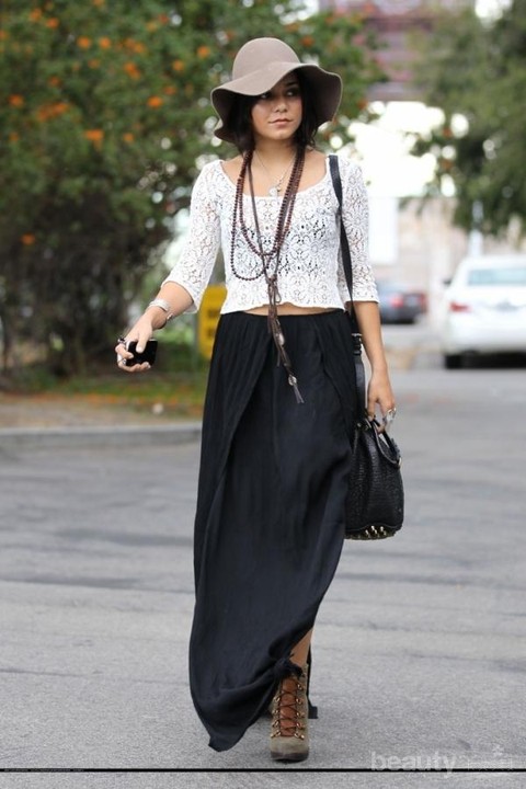 Maxi dress merupakan salah satu fashion item yang paling penting dalam boho style. Untuk penampilan sehari-hari, kamu bisa dengan mudah menggunakan maxi dress yang kemudian dipadukan dengan atasan lace. Untuk maxi dress, agar terlihat simpel kamu bisa memilih warna yang netral, seperti warna hitam. Bakal lebih oke dan terlihat lebih boho lagi jika kamu menggunakan ankle boots dengan warna yang senada. Buat memaksimalkan penampilan, kamu juga bisa menambahkan topi lho sebagai aksesoris.