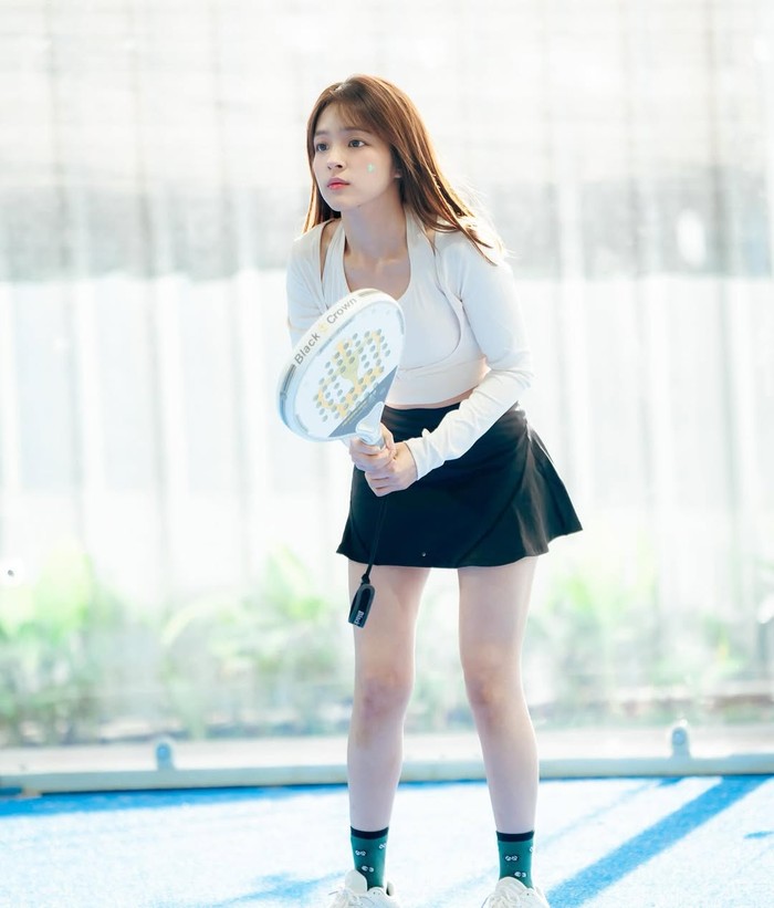 Elsa Japasal atau Eca Aura tampak menggemaskan dengan outfit padel. Ia mengenakan atasan putih berupa bra top yang dibalut outer lengan panjang, lalu dipadu rok hitam, dan disempurnakan sepatu putih lengkap kaus kaki hijau yang vintage.