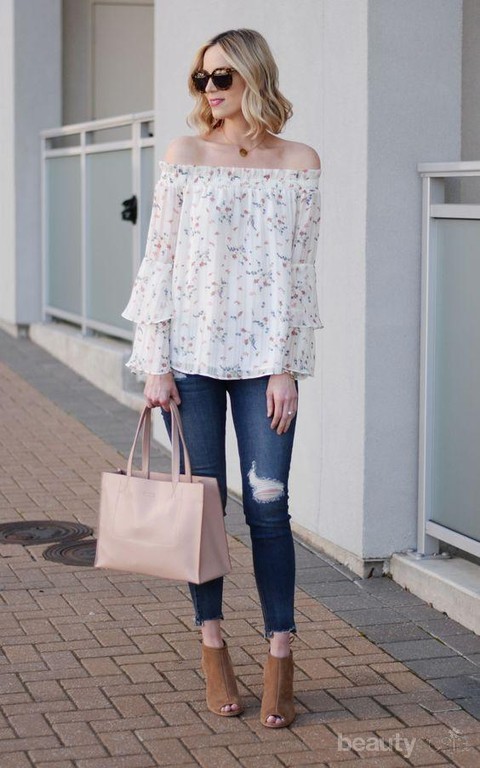 Jika ladies ingin tampil feminin dengan sepatu boots, bisa coba mix and match outfit kamu dengan sepatu boots model peep toe. Sedikit perbedaan dengan jenis boots lain yaitu bagian depannya yang sedikit terbuka, yang menampakkan sedikit bagian jari kaki. Atasan sabrina dengan motif floral sudah memberikan kesan feminin. Cukup padukan dengan denim pants, atau bisa juga menggunakan skirt polos.