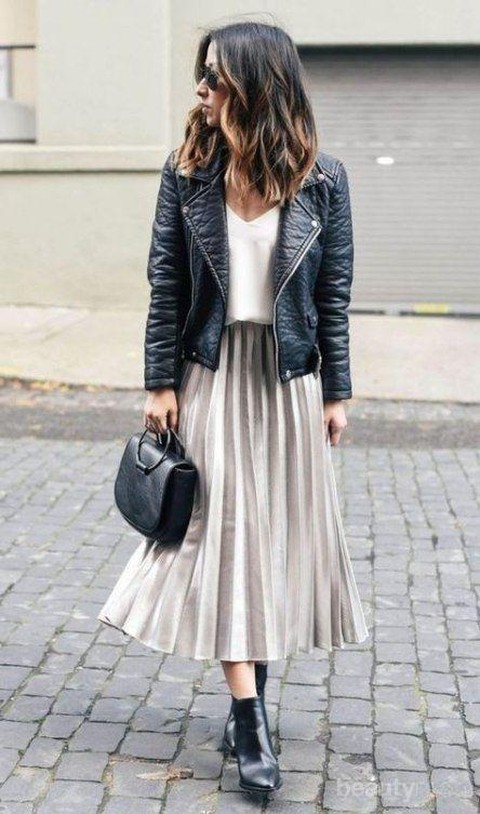 OOTD yang satu ini juga bisa Ladies coba jika ingin hangout. Plisket skirt dan v-neck skirt sangat pas dipadukan dengan ankle boots yang memiliki bentuk lancip pada bagian depan. Penggunaan jaket kulit juga membuat Ladies terlihat lebih sporty namun tetap girly dengan plisket skirt.
