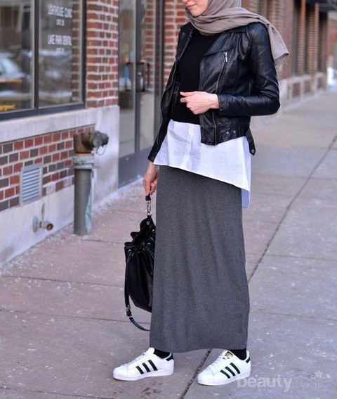 outfit leather jacket dengan hijab adalah