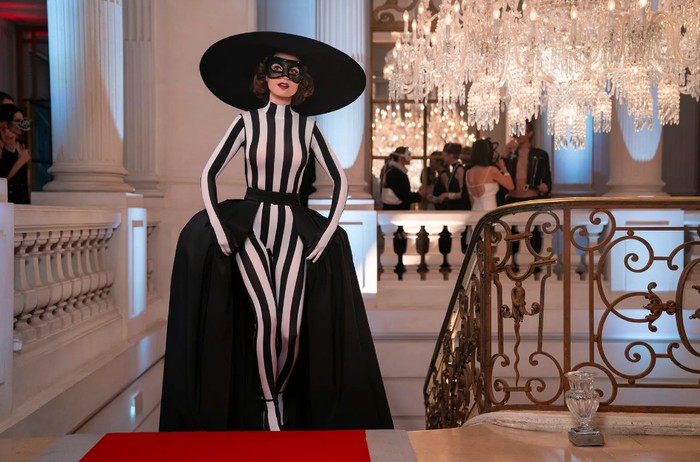 Emily Cooper berhasil mencuri perhatian dengan gaun bermotif garis putih dan hitam yang ia pakai di pesta topeng. Gaun dengan motif yang sama sebelumnya pernah dikenakan juga oleh tokoh Eliza Doolittle yang diperankan Audrey Hepburn, sehingga sudah pasti menjadi inspirasi utama untuk penampilannya malam tersebut.
