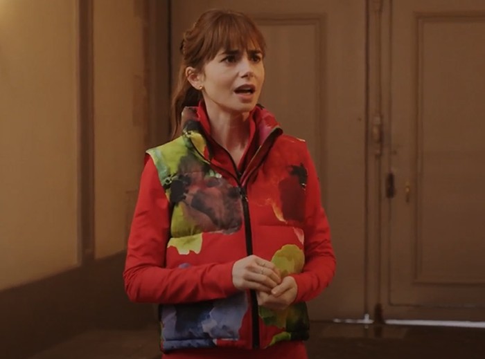 Sebagai seorang yang terobsesi dengan Paris dan mode fashion di dalamnya, Emily memilih untuk mengenakan atasan dari Goldbergh berwarna merah lengan panjang berleher tinggi dan half-zip. Atasan yang terang ini ditimpa lagi dengan puffy vest dengan warna dasar serupa dan motif bunga-bunga dari merek Stine Goya yang memberikan kesan playful untuk outfit-nya yang memang sudah berwarna cerah. Rambutnya yang berwarna coklat ia kuncir tinggi agar tidak mengganggu aktivitas larinya.