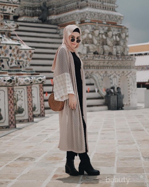 Aghnia menggunakan perpaduan nude dan hitam untuk style nude yang lebih bold. Perpaduan long outer rubiah dengan skinny pants dan kaos hitam adalah pilihan tepat yang menghasilkan gaya stylish kekinian.