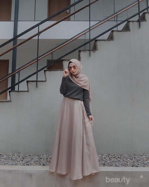 Warna nude akan semakin terlihat modern dengan perpaduan pada motif stripes monochrome seperti yang dikenakan Nisa ini. Kaos hitam putih bergaris dengan rok dan pashmina nude menjadi kombinasi yang tepat tampilan modis natural masa kini.