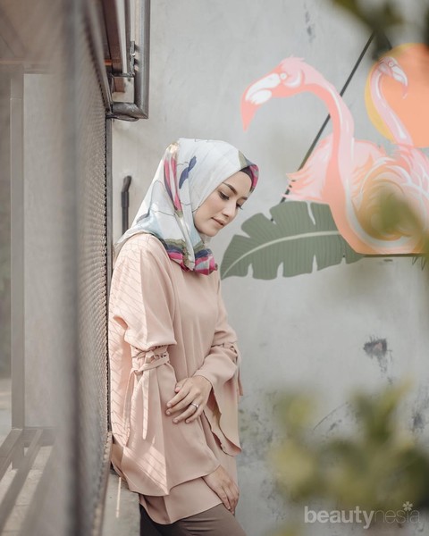 Selanjutnya, style perpaduan antara bell sleeve top warna nude dengan hijab voal motif juga dapat menjadi pilihan tampilan hijab modis kekinian warna nude. Mega terlihat cantik dan manis dengan style kasual yang satu ini.