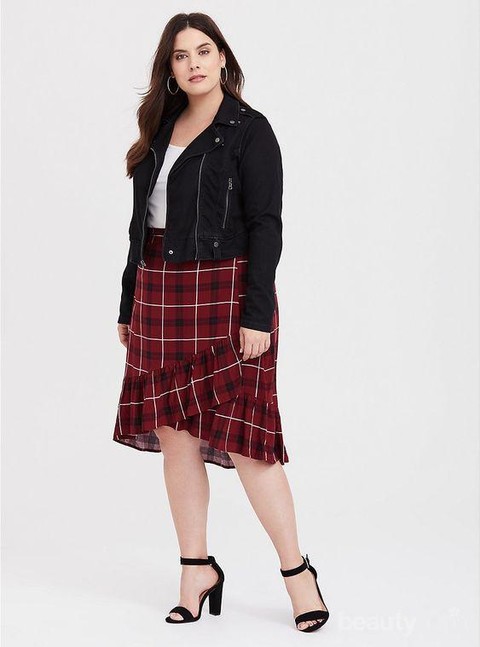 Punya badan berisi? Jangan minder. Kamu tetap masih bisa fashionable dengan rok warna merah, kok. Misalnya seperti rok warna merah maroon motif kotak ini. Supaya terlihat lebih stylish, padukan dengan kaus putih dan jaket warna hitam. Voila! Kece banget, 'kan?