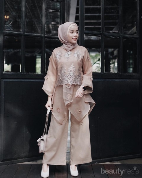 Bahan organza memang memiliki keunikan tersendiri dan membuatnya terlihat elegan. Namun, jika kamu menginginkan tampilan yang lebih mewah, cobalah tengok organza top milik Aghnia Punjabi yang satu ini. Detailnya menyerupai payet-payet kebaya yang sangat cantik di bagian atas, sedangkan pada bagian bawah yang beraksen segitiga dan lengan terdapat detail berbentuk bunga warna cokelat. Dengan keberadaan kedua detail ini membuat tampilan blouse semakin mewah dan one of a kind!