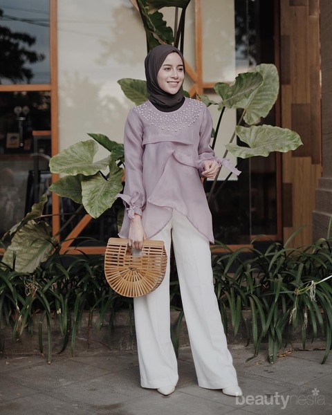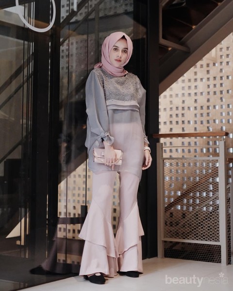 Nah, agar tidak terlalu gelap dan monoton, Aghnia memadukan silver blouse ini dengan celana beraksen flare dan hijab berwarna pink pastel. Warna ini sangat cocok jadi pasangan warna silver. Aksesoris berupa jam dan clutch yang dipilih Aghnia juga berwarna pink pastel, lho!