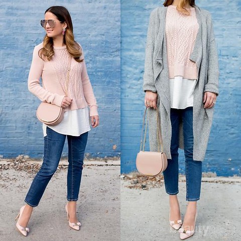 casual look. Adalah Long Cardigan with jeans. Pemilihan warna cardigan nude dengan